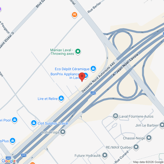 Nous sommes sur la desserte nord de l'autoroute 440, juste à l'ouest du boulevard Industriel, dans la bâtisse adjacente au Eco Depôt Ceramique.